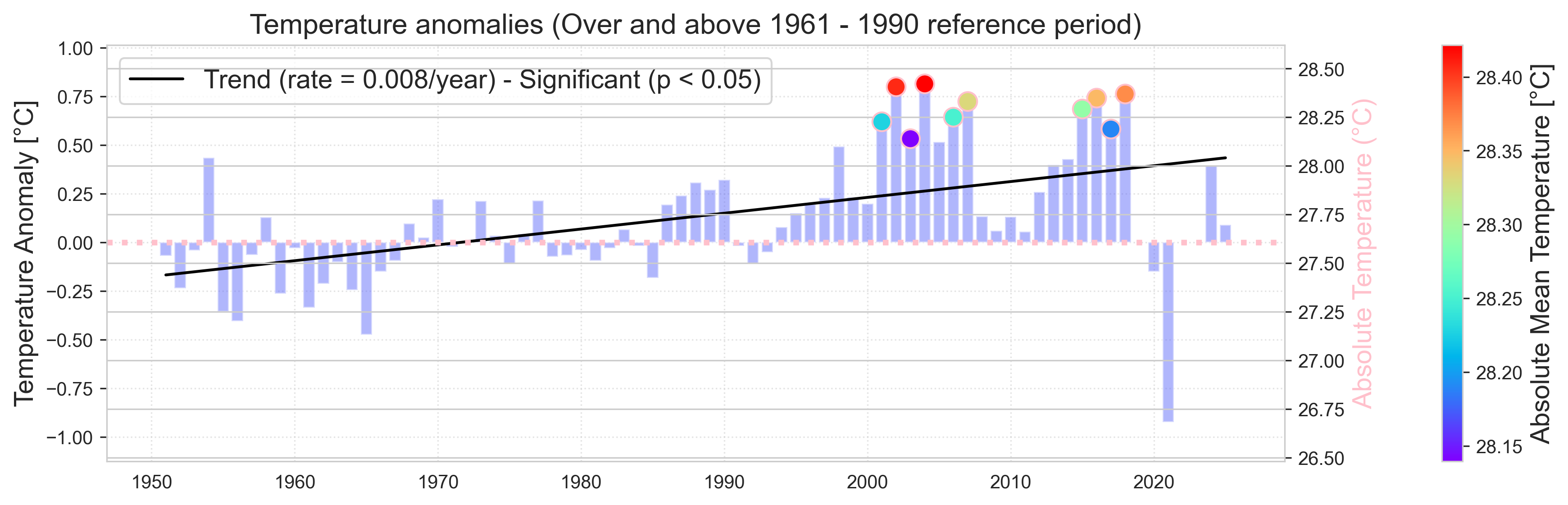 Figure 2 Annual mean temperature anomalies relative to 1961:1990 climatology at Koror.