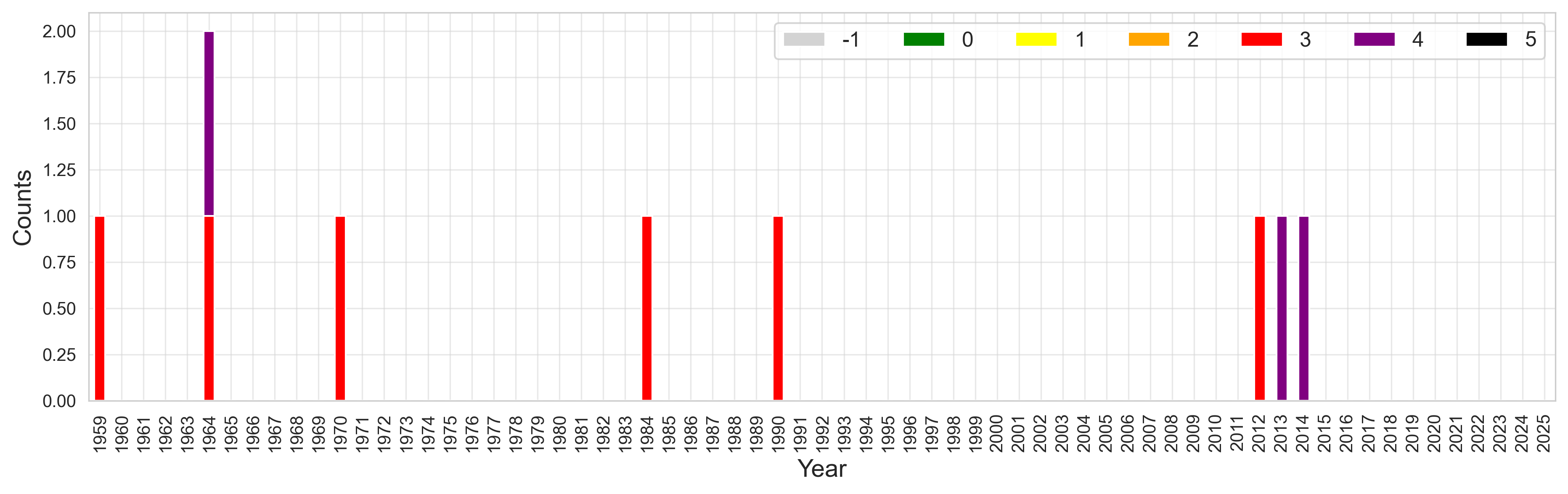 Saffir Simpson scale for wind intensity (see text for details). Grey represents TCs where no wind information