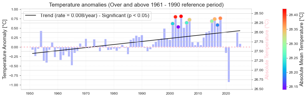 Figure: Annual mean temperature anomalies relative to 1961–1990 climatology at Koror. The colored dots represent the 10 warmest years on record, with the absolute values shown along the right axis. The solid black line represents the trend, which is statistically significant (p < 0.05). From NOAA ESRL Global Monitoring Division. https://www.esrl.noaa.gov/gmd/ccgg/trends/