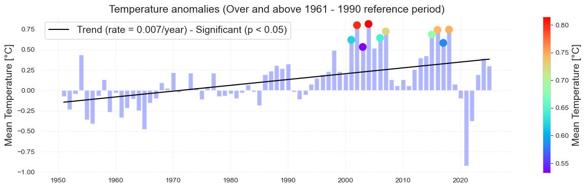 Fig. 1 Annomaly of the mean temperature over and above the 1961-1990 reference period. Overlapping points correspond to the top 10 warmer years.#