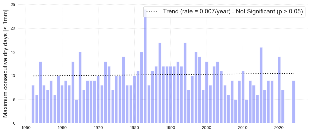 trendline =True, y_label = 'Maximum consecutive dry days [< 1mm]', return_trend = True,