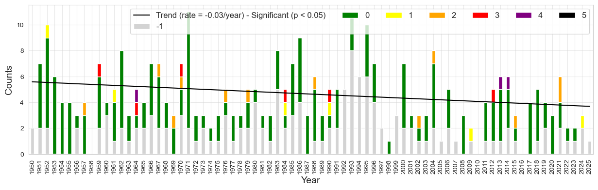 The following bar plot displays the TC count per year and per category, as well as the trend.