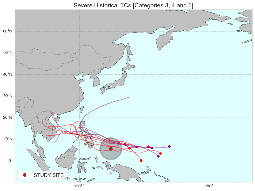 ax.set_title('Severe Historical TCs [Categories 3, 4 and 5]', fontsize = 14)