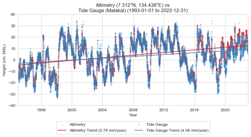 In this notebook, we’ll be creating a table, a map, and a time series plot of absolute and regional sea level change at the Malakal, Palau tide gauge station from 1993-2022. Absolute sea level, typically measured by satellite altimetry, refers to the height of the sea surface relative to a reference ellipsoid. Here, we’ll use the global ocean gridded L4 Sea Level Anomalies (SLA) available from Copernicus, which is the sea surface height (SSH) minus the mean sea surface (MSS), where the MSS is the temporal mean of SSH over a given period. Relative sea level is measured by a tide gauge, and is the sea level relative to land at that location. Differences between the two measurements can arise from vertical land motion, regional oceanographic conditions like currents, and changes to the gravitational field (affecting the geoid).